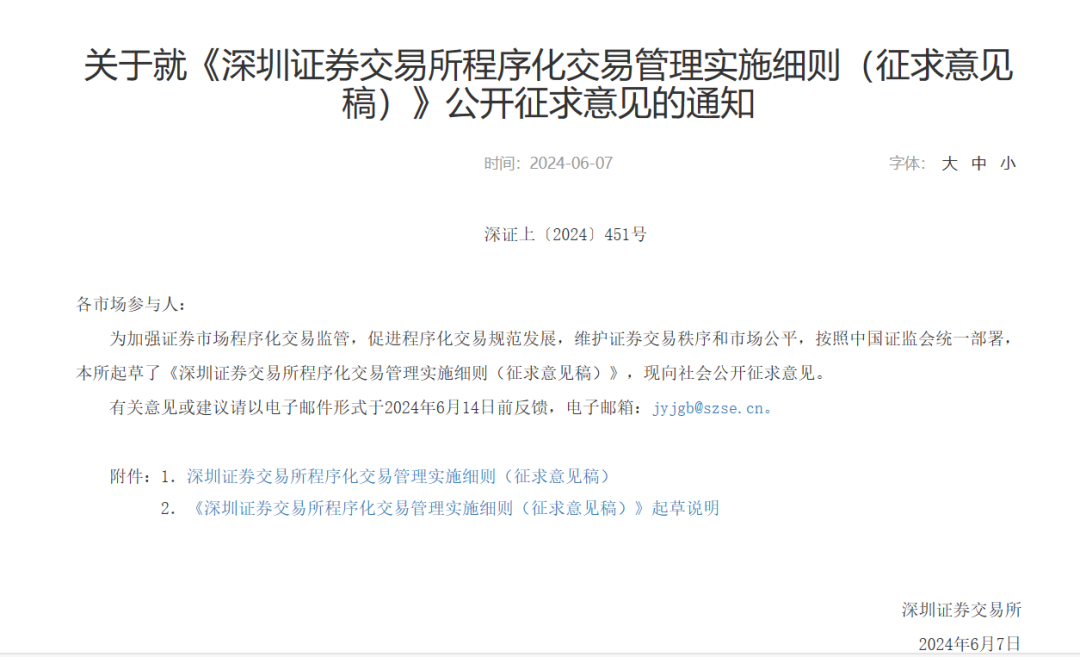 6月7日,沪深交易所均发布《程序化交易管理实施细则(征求意见稿)》(以下简称《实施细则》),即日起向市场公开征求意见。据悉,《实施细则》包括总则、报告管理、交易行为管理、信息系统管理、高频交易管理、深股通管理、监督检查和附则共八章四十四条。